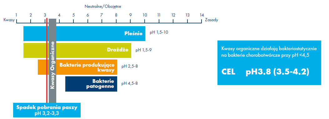- Dobranie odpowiedniej mieszaniny kwasów pozwalającej na obniżenie pH w paszy.