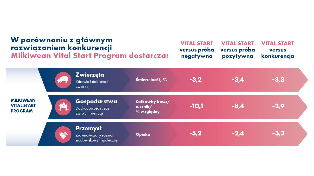 Program Milkiwean Vital Start umożliwia producentom wspieranie rozwoju prosiąt w trakcie trudnego procesu odsadzania i robienie tego w sposób zrównoważony. Kluczowe elementy strategii żywieniowych obejmują smakowitość, która jest niezbędna do wspierania regularnego i zdrowego pobierania paszy na wczesnym etapie życia zwierzęcia, a także dobór najwyższej jakości źródeł białka w celu zapewnienia
