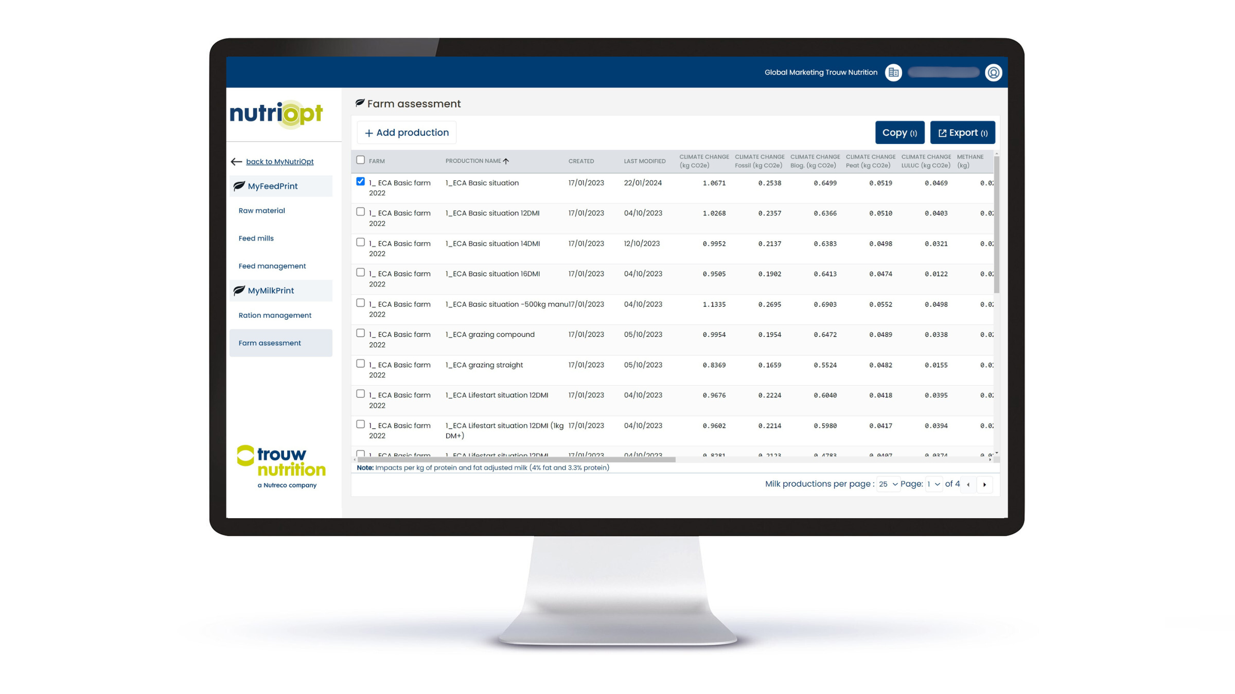 MyMilkPrint zapewnia doradcom ds. pasz ogólną ocenę śladu środowiskowego produkcji mleka przez rolników od kołyski do gospodarstwa, a także dogłębny wgląd w emisję gazów cieplarnianych podczas produkcji. MyMilkPrint oferuje dogłębny wgląd w kilka czynników, takich jak wykorzystanie energii w gospodarstwie, zakup paszy i transport, a także emisje metanu w jelitach, metanu z obornika i podtlenku azotu. W ten sposób można zminimalizować wpływ produkcji mleka na środowisko i zwiększyć ogólny zrównoważony rozwój.