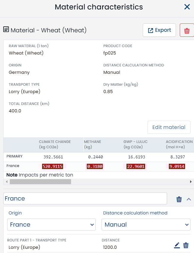 You can easily compare results for the same ingredient with different origins or transport distances. The results will be presented in comparison with your primary ingredient with higher (red) or lower (green) values for the newly defined ingredient. This allows you to make informed decisions on the purchase of raw materials.