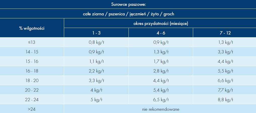 • Mieszanka paszowa: ≤13% wilgotności, okres przydatności do spożycia <3 miesiące: 0,6-1,9 kg/t
