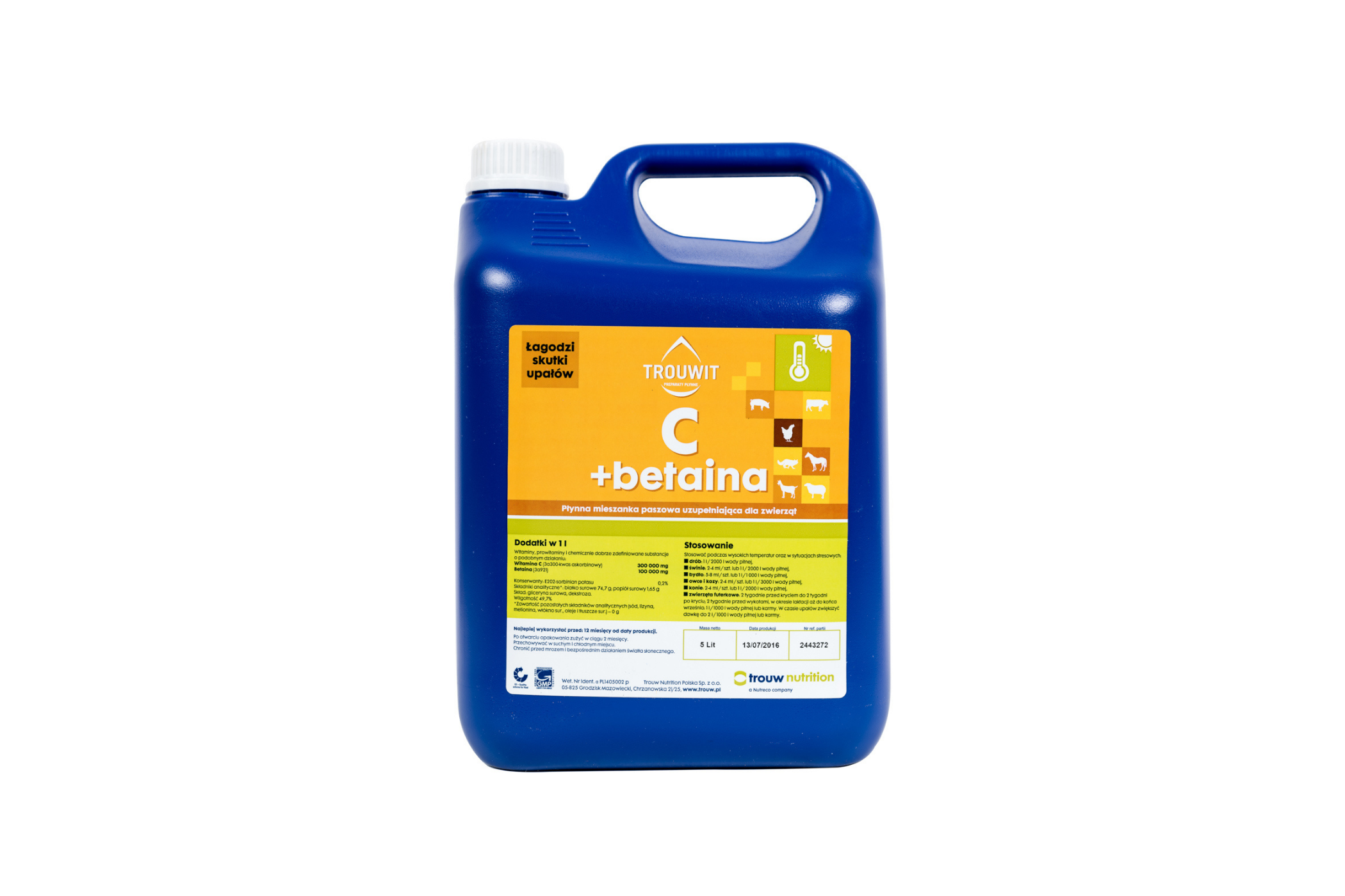 Płynna mieszanka paszowa uzupełniająca wskazana podczas upałów. Połączenie betainy pełniącej funkcję osmoregulacyjną i stabilizującą z witaminą C, zapewnia ochronę w stanach napięcia wywołanych m.in. wysoką temperaturą powietrza. Preparat chroni komórki przed odwodnieniem dzięki czemu utrzymuje prawidłowe funkcjonowanie układu trawiennego. Stosować również przy spadkach odporności oraz po wysiłku (wspomaga wzrost mięśni).
