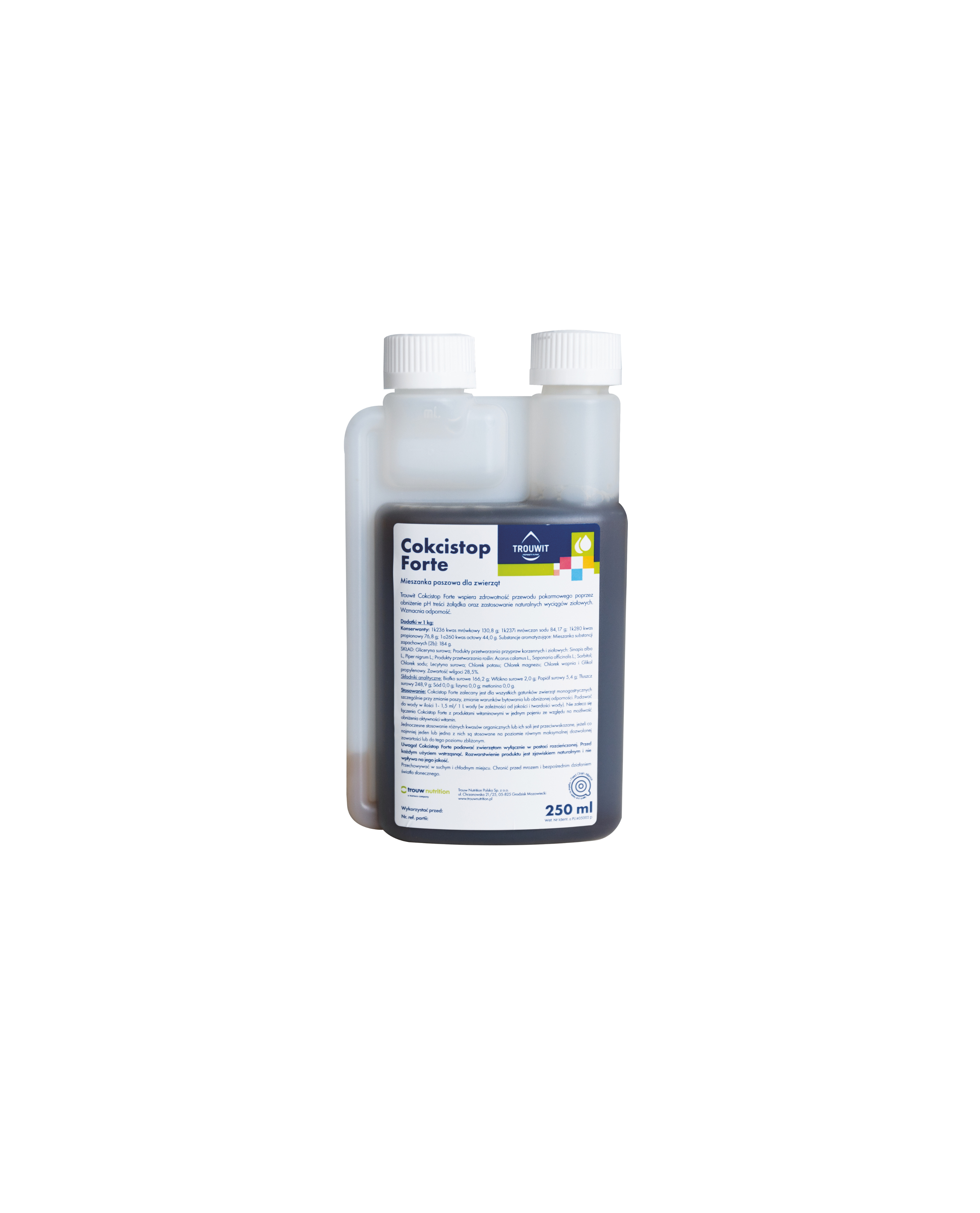 Cokcistop Forte łączy korzystne działanie kwasów organicznych i naturalnych substancji ziołowych w jednym produkcie wzmacniając zdrowotność i odporność całego organizmu. Preparat wykazuje silne działanie zakwaszające w przewodzie pokarmowych wspierając naturalną barierę ochronną przed bakteriami Gram-ujemnymi. Obniżenie pH treści żołądka stymuluje trawienie oraz pozytywnie wpływa na równowagę mikrobiologiczną w przewodzie pokarmowym zwierząt. Dodatek precyzyjnie skomponowanych ziół korzennych pobudza apetyt zwierząt, poprawia funkcje trawienne żołądka oraz wspiera aktywność organizmu przeciwko infekcjom pierwotniakowym i bakteryjnym. Dzięki tak kompleksowemu rozwiązaniu Cokcistop Forte stabilizuje funkcjonowanie układu pokarmowego oraz ogranicza śmiertelności młodych zwierząt. Ponadto produkt wpływa na wyższe przyrosty wagowe i lepszą wydajność produkcyjną.