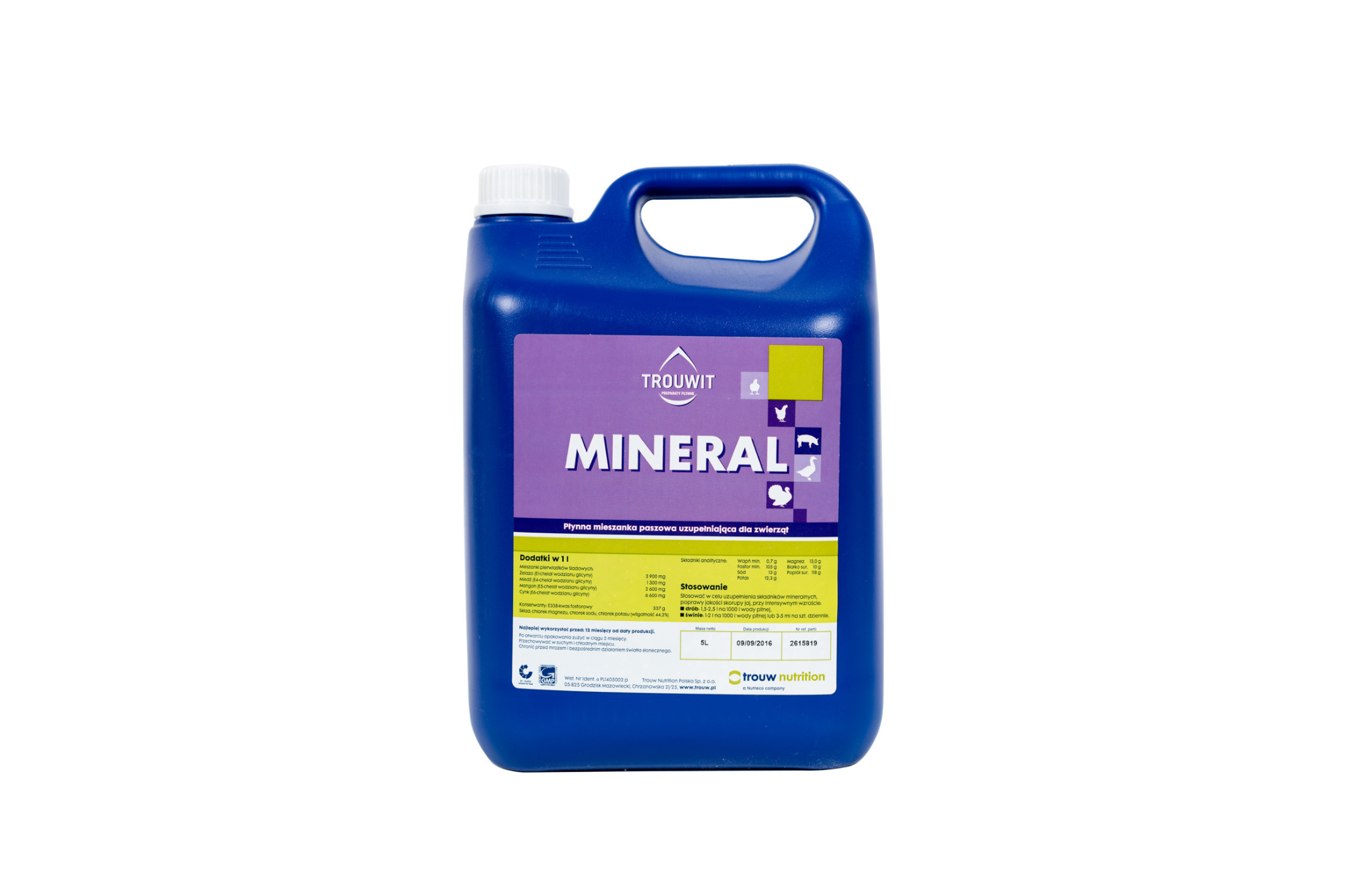 Trouwit Mineral jest płynną, mineralną mieszanką paszową uzupełniającą szczególnie zalecaną w żywieniu drobiu. Produkt zawiera optymalne poziomy makro i mikroelementów wspomagające prawidłowy rozwój i mineralizację kośćca oraz wysoką jakość skorupy jaj. Zaleca się jej stosowanie w okresowych niedoborach związków mineralnych, w sytuacjach wywołujących niepokój zwierząt oraz podczas wysokich temperatur. Trouwit Mineral wspomaga gospodarkę wodno-elektrolitową oraz chroni organizm przed przegrzaniem i odwodnieniem. Organiczne formy żelaza, miedzi, manganu i cynku gwarantują wysoką przyswajalność i lepsze wykorzystanie tych pierwiastków. Najlepsze efekty hodowlane i produkcyjne osiąga się stosując Trouwit Mineral naprzemiennie z produktami Trouwit Multi